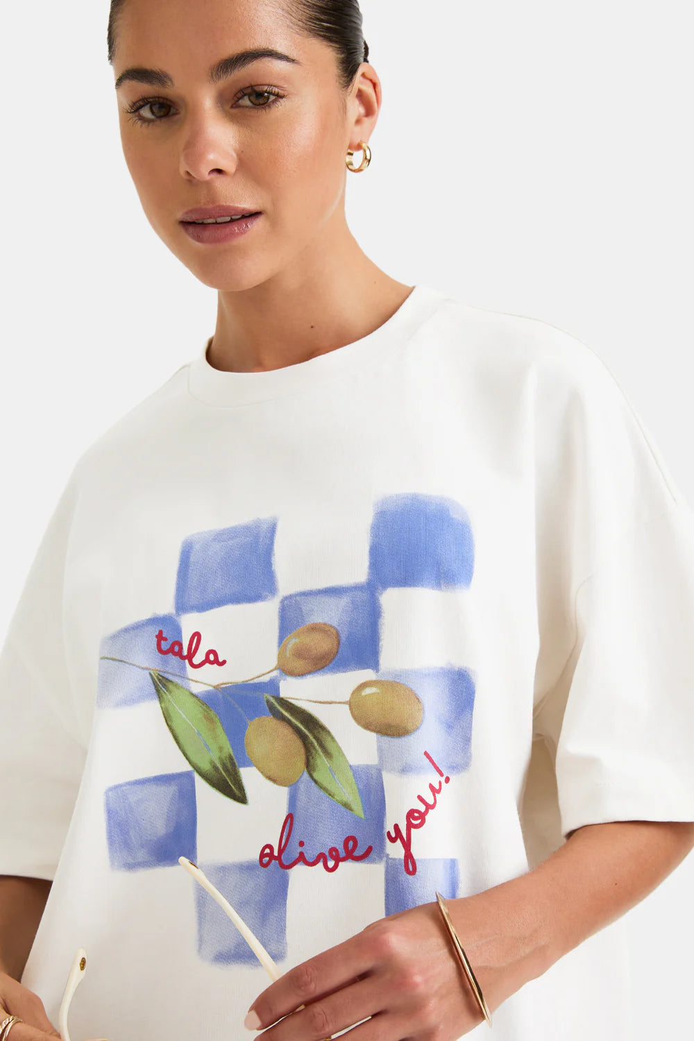 Designed in-house by our olive obsessed graphic designer. Throw on over your bikini or wear her to brunch back home.